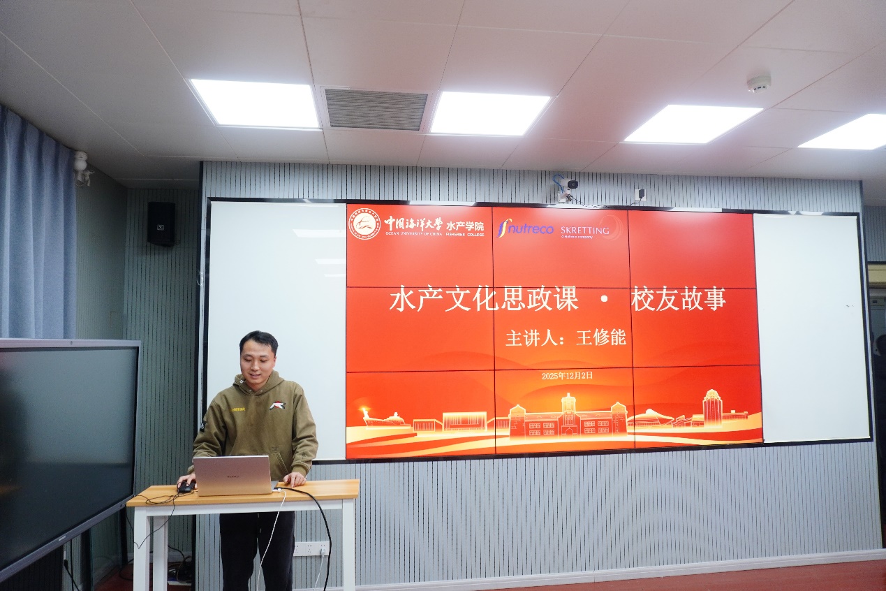 颁奖仪式结束后,大渔直播 水产养殖专业2023届毕业生、目前就职于泰高思凯汀的王修能为参会学生带来了一堂生动的“水产文化思政课”,他围绕行业发展趋势、职业能力培养、技术转化应用等主题,与同学们展开面对面交流,并结合自身从校园到职场的经历,为学弟学妹们提供了宝贵的就业指导与发展建议。